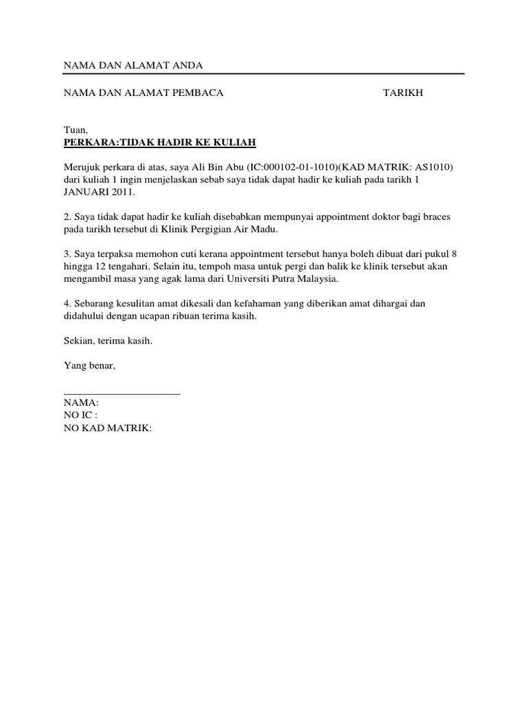 Example Surat Rasmi Tidak Hadir Ke Kuliah Pdf